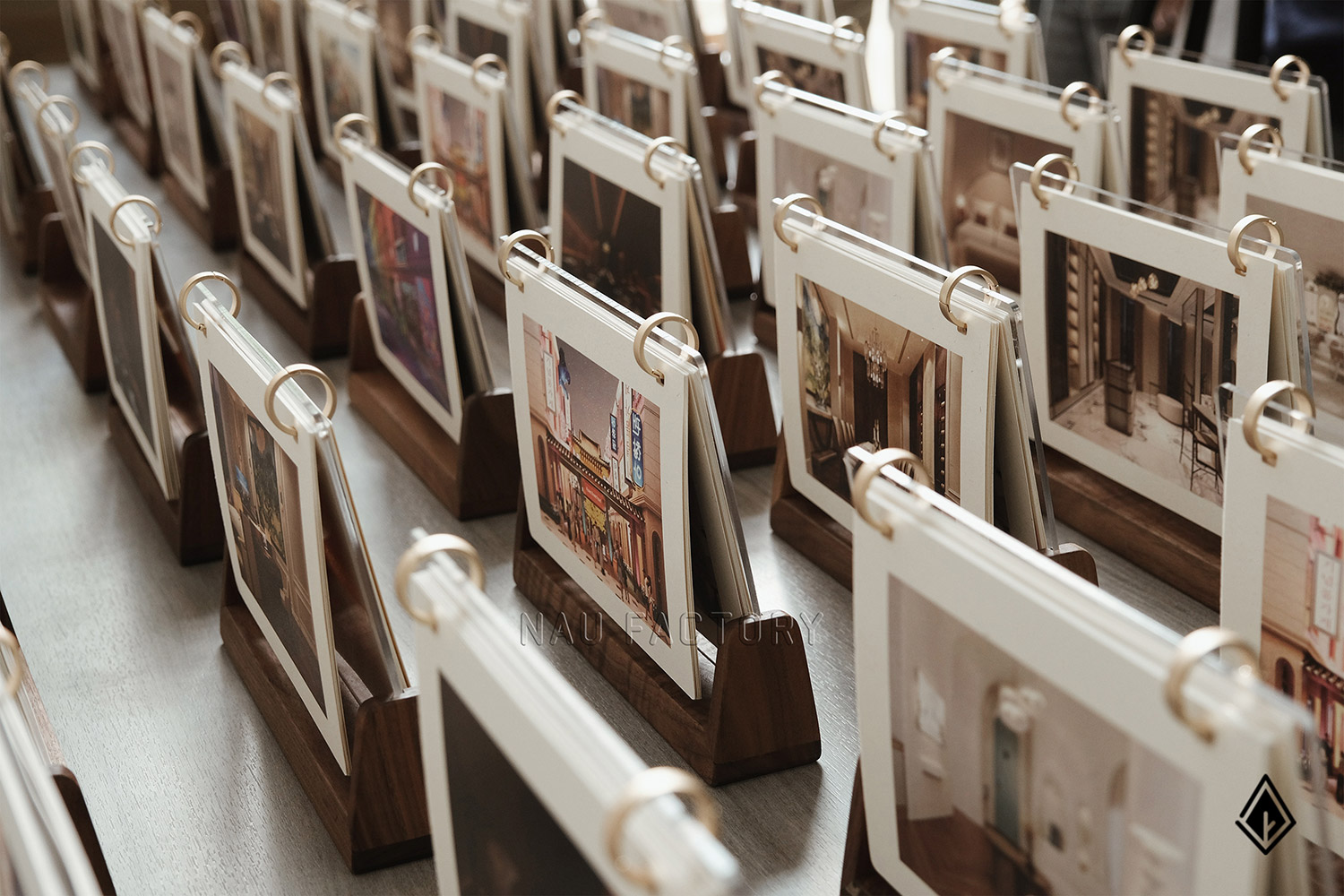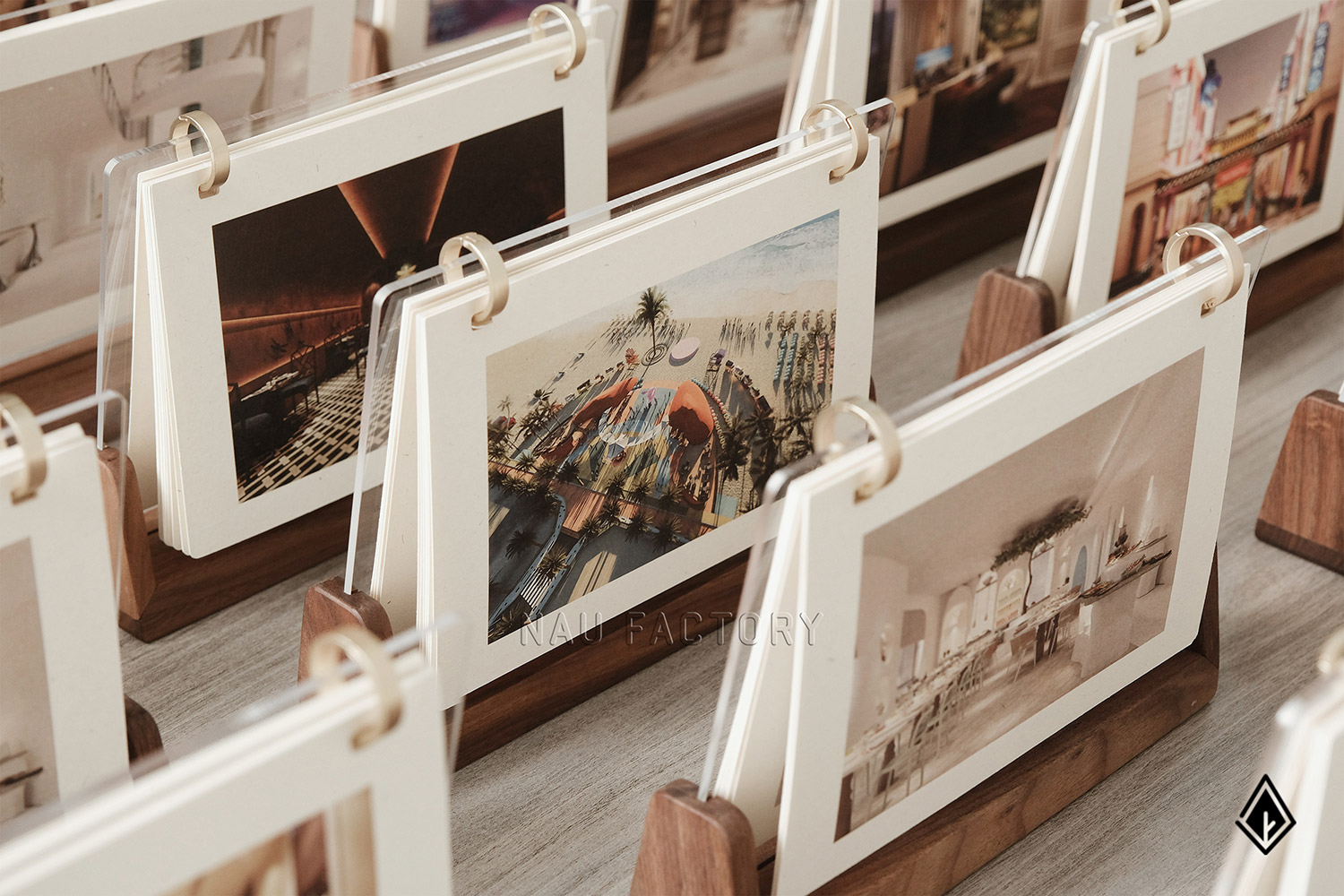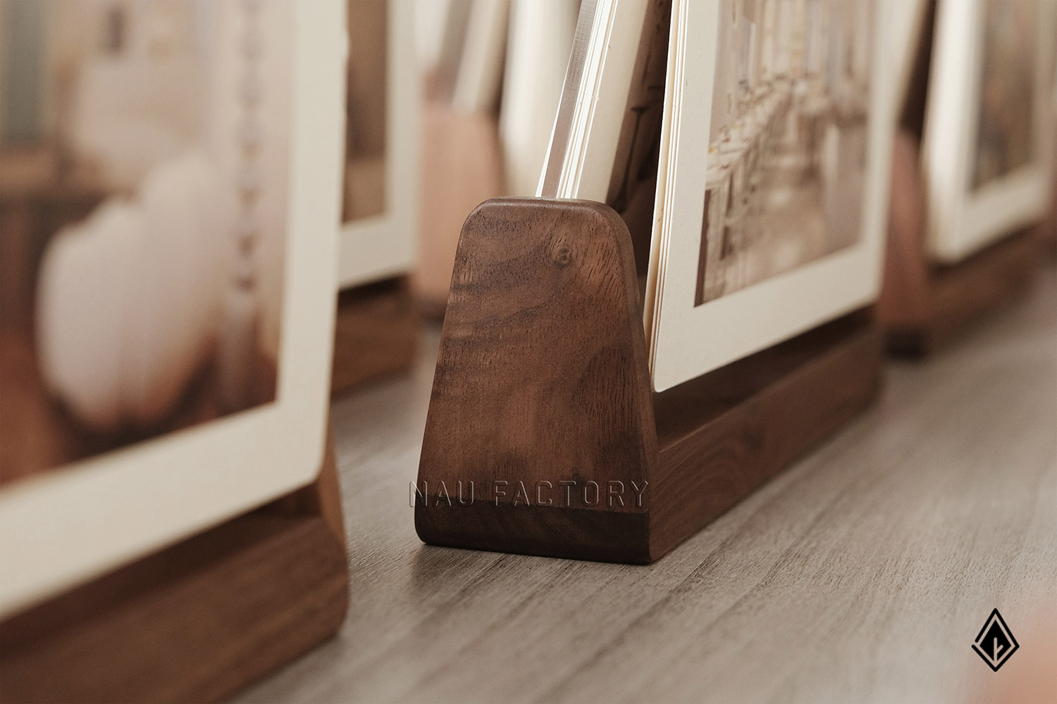 - Đế và tấm dựng từ gỗ Walnut nâu trầm / Mica trong suốt.